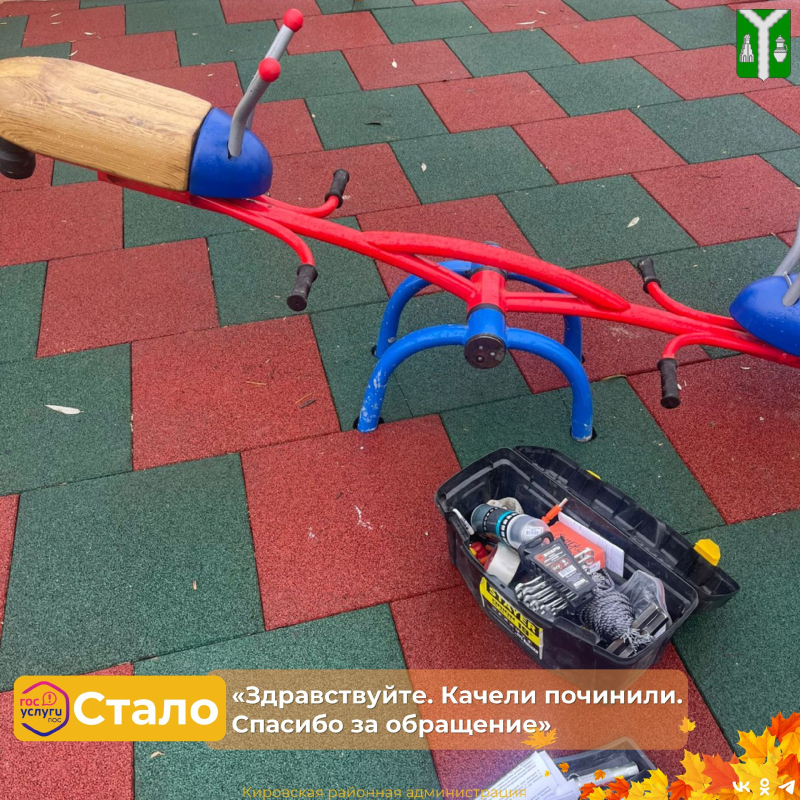 Через Платформу обратной связи в администрации получили обращение о том, что в сквере на ул.Пролетарская на качелях у жучка отломана голова, скручен болт.