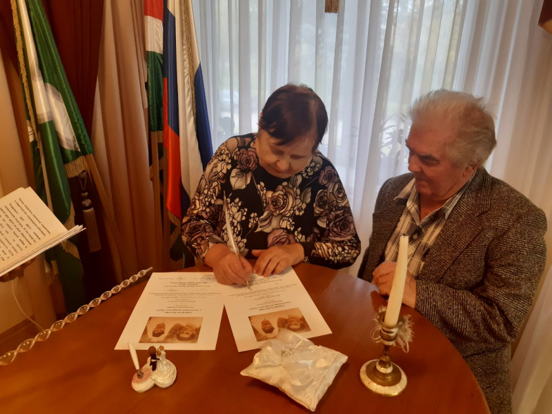 Супруги вновь почувствовали радость свадебного торжества, скрепили свой союз подписями в свидетельстве изумрудных юбиляров. В торжественной обстановке юбилярам вручили поздравительный адрес и альбом «Летопись семьи» от Губернатора Калужской области Владислава Валерьевича Шапши.